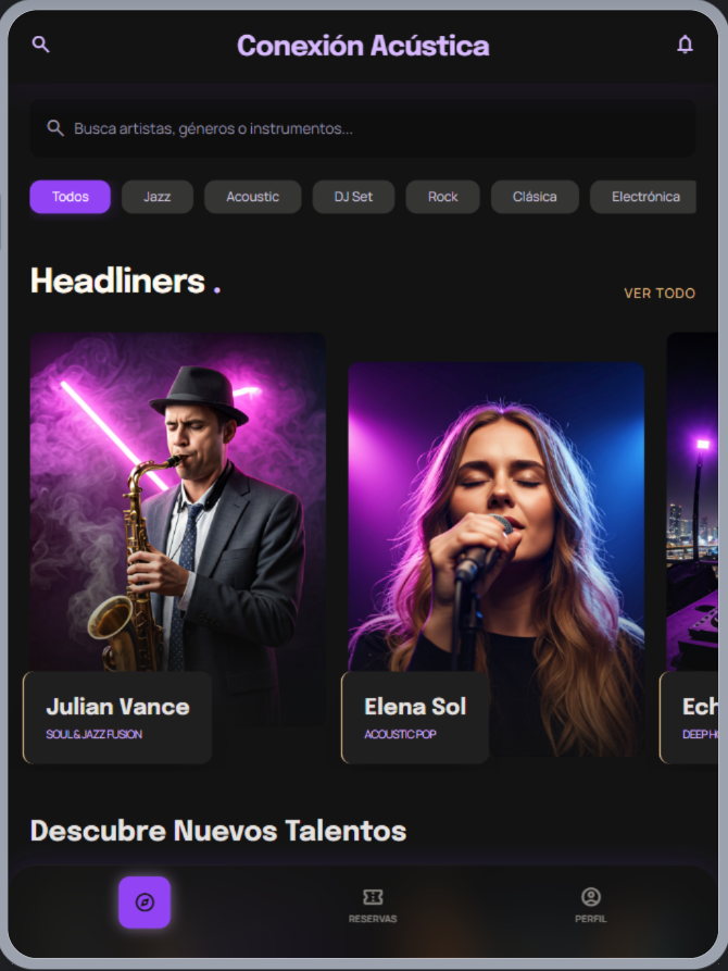 Aplicación enfocada en conectar artistas con usuarios, ofreciendo una experiencia intuitiva para descubrir talento y gestionar eventos musicales.